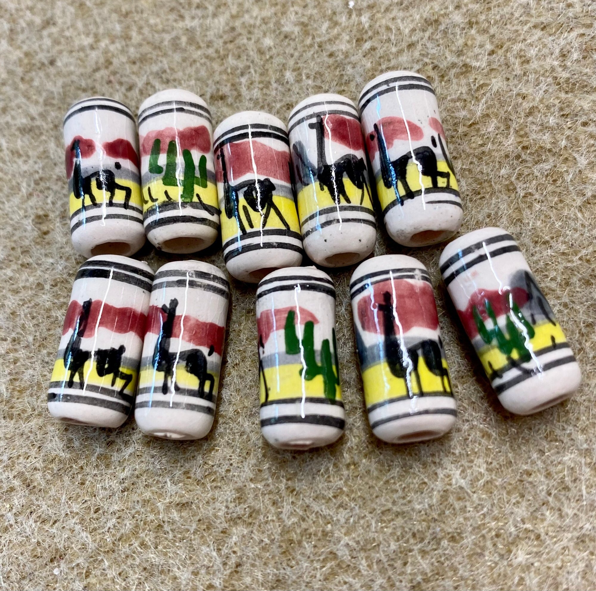 These Peruvian ceramic tube beads depict a llama in the high Andes. These beads are about 18mm in length and 8 mm wide, with 3 mm holes. Great for macrame, knitting or any project requiring larger hole beads! You'll get 10 beads in yellow and pink!